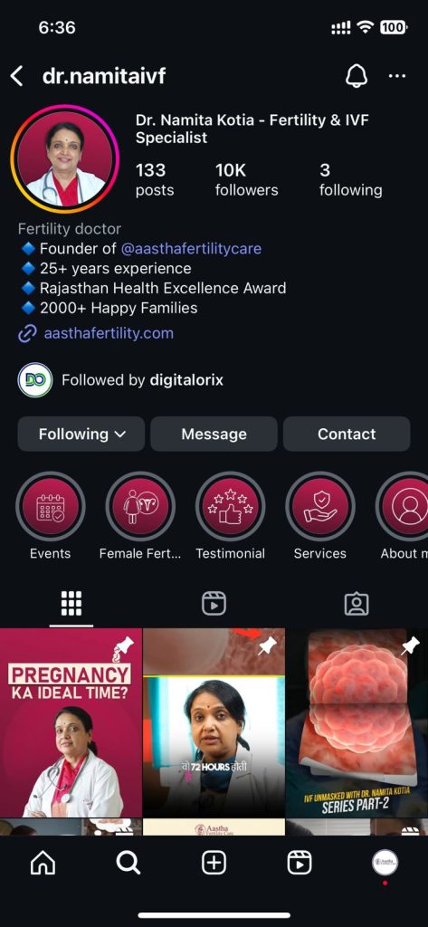 - Instagram Lives: We conducted a few Instagram Lives where Dr. Namita directly interacted with her audience, answered questions about fertility, IVF, and women’s health, and gave people a real-time experience of her knowledge. Lives are one of the most powerful tools for human connection on Instagram, and for a doctor, they are incredibly effective in turning followers into patients.